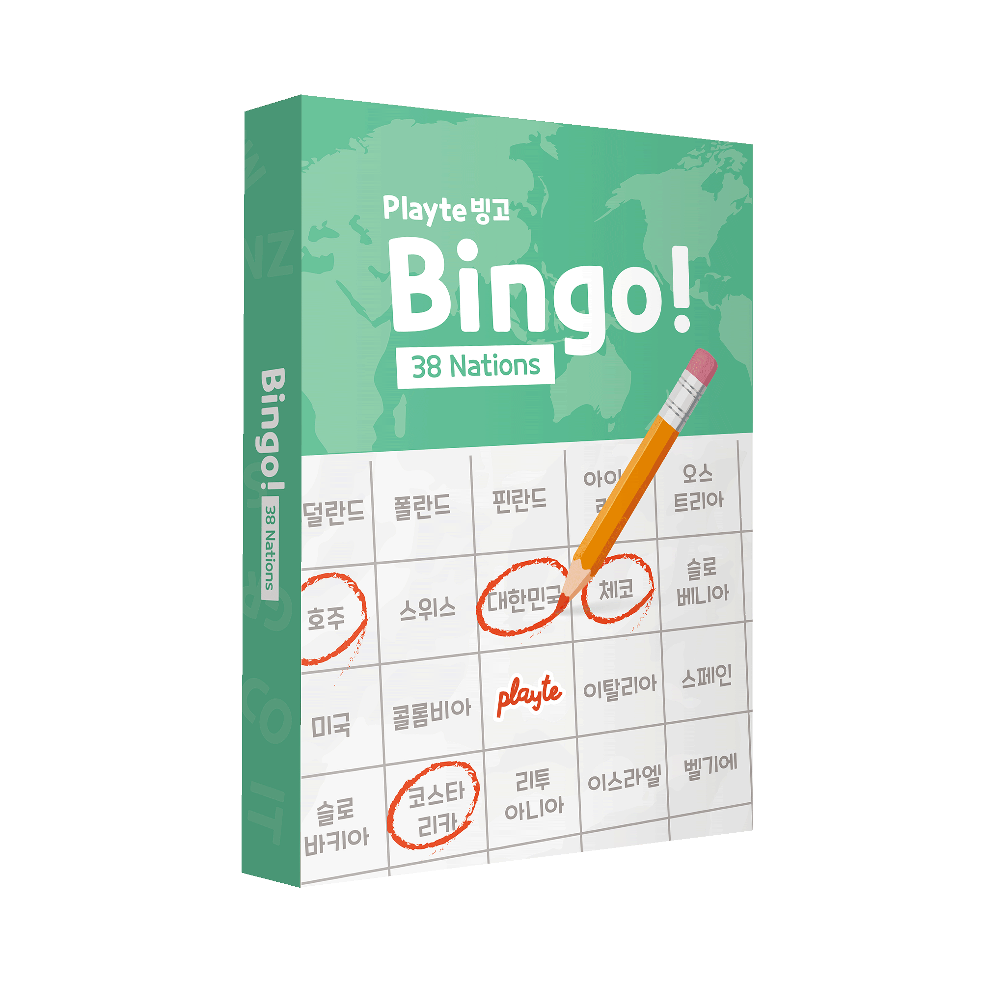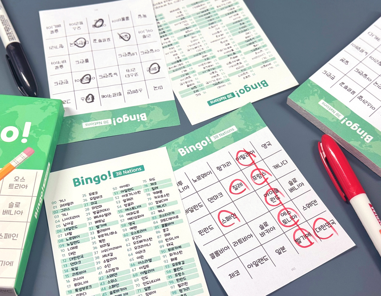 전통적인 빙고 방식에 지리적 요소와 전략적 선택을 더한, 지금껏 본 적 없는 신개념 빙고 게임이에요. 나라 이름을 부르며 라인을 완성해나가는 이 간단한 규칙 속에 놀라운 몰입감과 긴장감이 숨어있답니다. 준비물은 단 하나, 펜! 별도의 빙고 번호 추첨기 없이 간단히 펜만 있으면 어디서나 즐길 수 있어요. 컴팩트한 구성 덕분에 모임, 가족 여행, 수업 시간에도 딱 좋은 게임이죠!