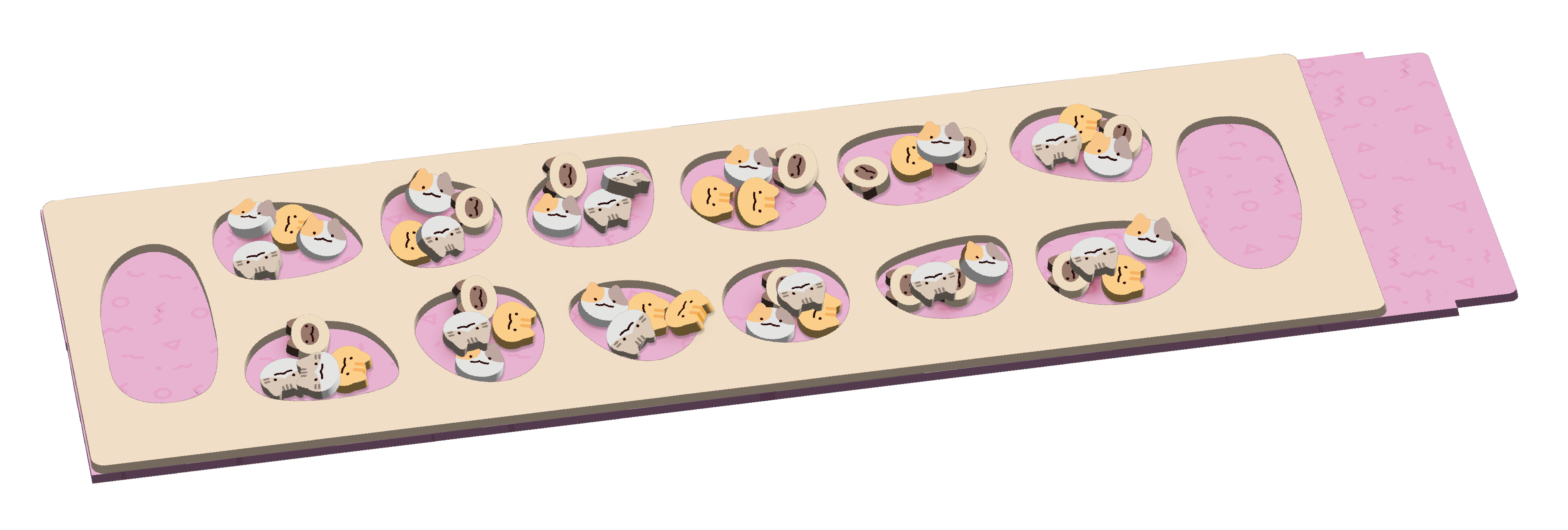 이번 냥칼라에서는 Playte의 독자적인 디자인으로 제작된 이중 보드 트레이가 눈길을 끕니다. 두 겹의 게임 보드가 하나로 포개져,