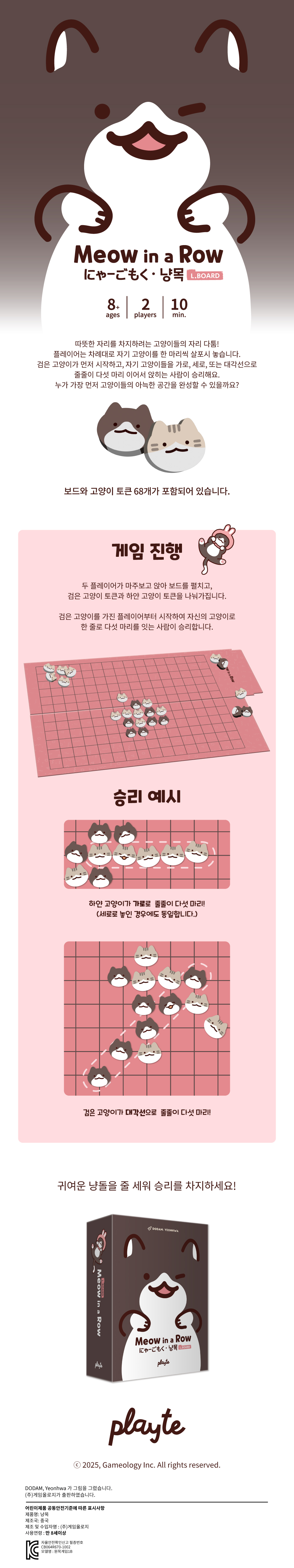 플레이어는 차례대로 자기 고양이를 한 마리씩 살포시 놓습니다. 검은 고양이가 먼저 시작하고, 자기 고양이들을 가로, 세로, 또는 대각선으로 줄줄이 다섯 마리 이어서 앉히는 사람이 승리해요. 누가 가장 먼저 고양이들의 아늑한 공간을 완성할 수 있을까요?