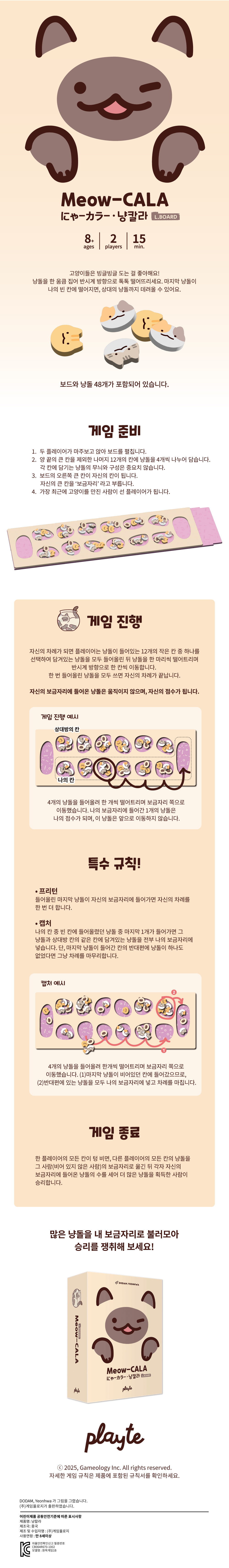 고양이들은 빙글빙글 도는 걸 좋아해요! 냥돌을 한 움큼 집어 반시계 방향으로 톡톡 떨어뜨리세요. 마지막 냥돌이 나의 빈 칸에 떨어지면, 상대의 냥돌까지 데려올 수 있어요.