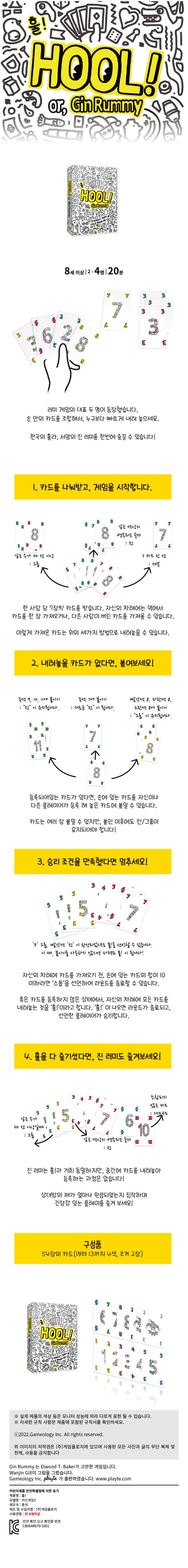 훌! 은 자신의 카드를 3장 이상의 런 (Run) 또는 그룹 (Group), 세븐 (Seven)으로 만들어 내려놓는 게임입니다. 모든 카드를 먼저 내려놓으면 승리하지만, 현재 들고 있는 카드 숫자들이 충분히 낮다고 생각한다면 라운드를 스톱하고 조기에 승리를 거머쥘 수도 있습니다.