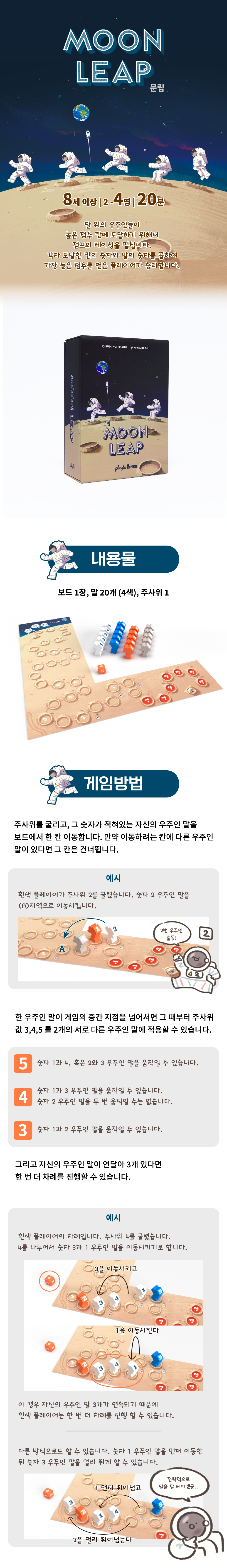 달 위의 우주인들이 가장 높은 점수 칸에 도달하기 위해서 점프의 레이싱을 펼칩니다. 게임이 끝났을 때 각자 도달한 칸의 숫자와 말의 숫자를 곱하여 가장 높은 점수를 얻은 플레이어가 승리합니다. 잊지 마세요! 달에서 점프로 이동하는 것이 쉽지만은 않습니다.