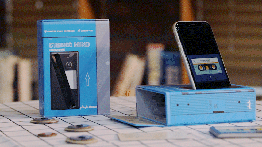 2. 카세트테이프 카드 더미의 맨 윗장을 열어서 내용이 보이도록 더미 옆에 놓습니다. 스마트폰으로 더미 맨 윗장의 QR 코드를 스캔합니다. 재생 버튼을 누르면 음악이 흘러 나옵니다.