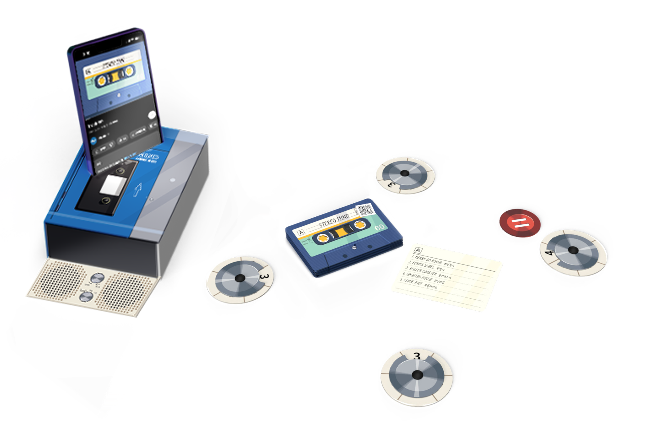 카세트테이프 카드 60장, 다이얼 5개, 일시 정지 타일 1개