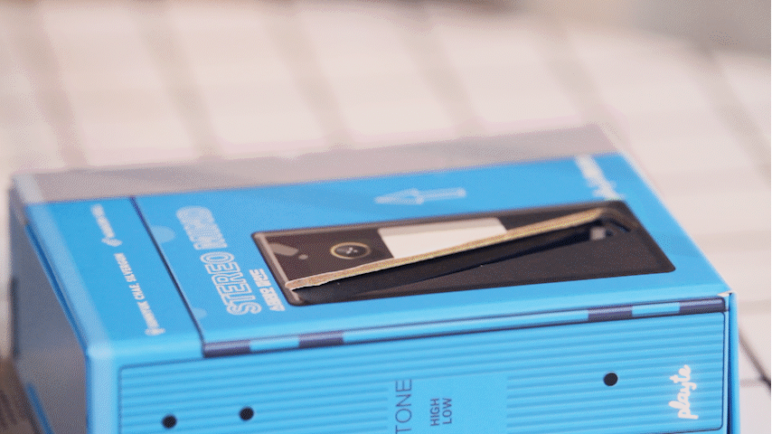 2. 카세트테이프 카드 더미의 맨 윗장을 열어서 내용이 보이도록 더미 옆에 놓습니다. 스마트폰으로 더미 맨 윗장의 QR 코드를 스캔합니다. 재생 버튼을 누르면 음악이 흘러 나옵니다.