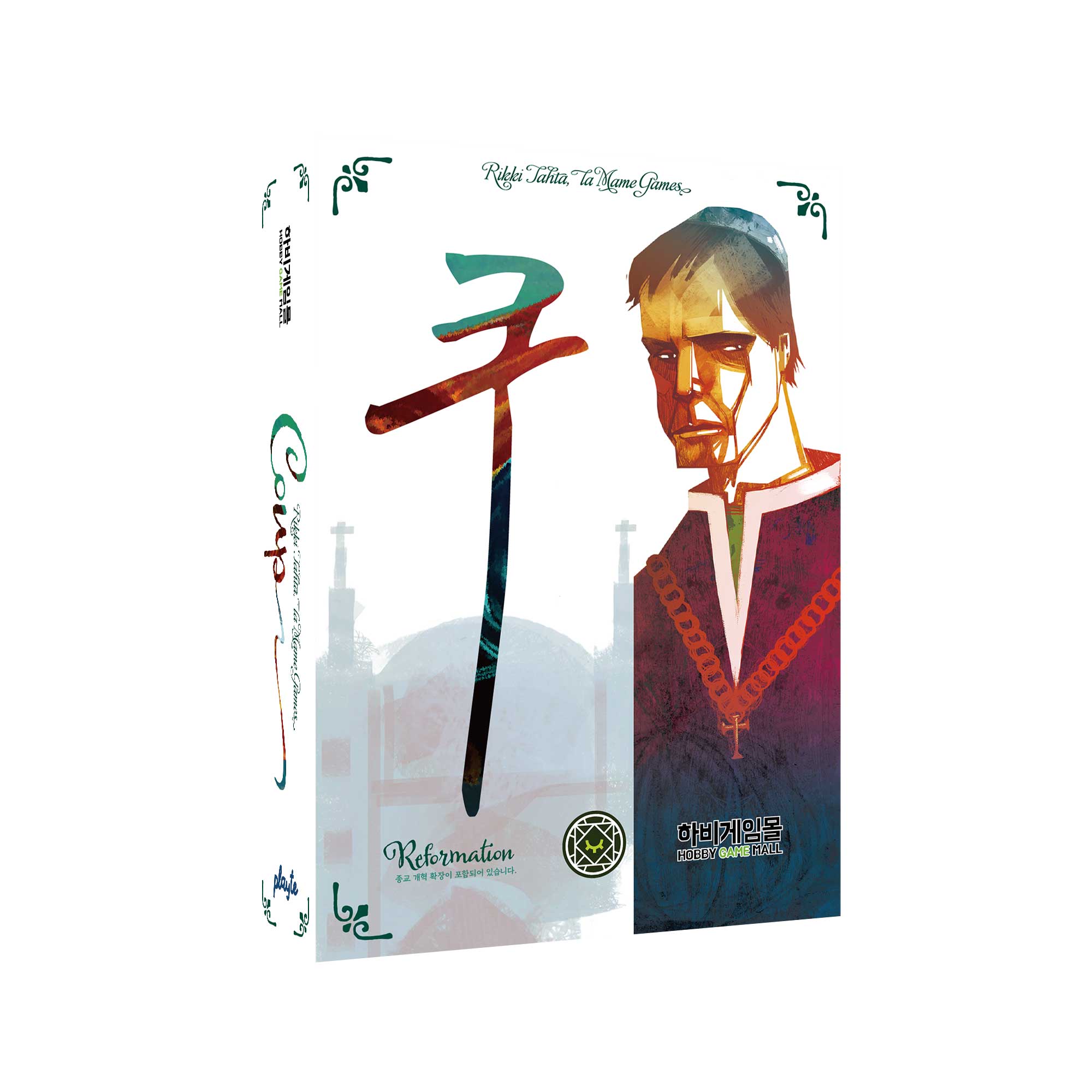 캐릭터 카드 18장, 요약카드 6장, 은화 토큰 30개, 금화토큰 6개, 종교 카드 6장, 피난처 카드 1장, 설명서